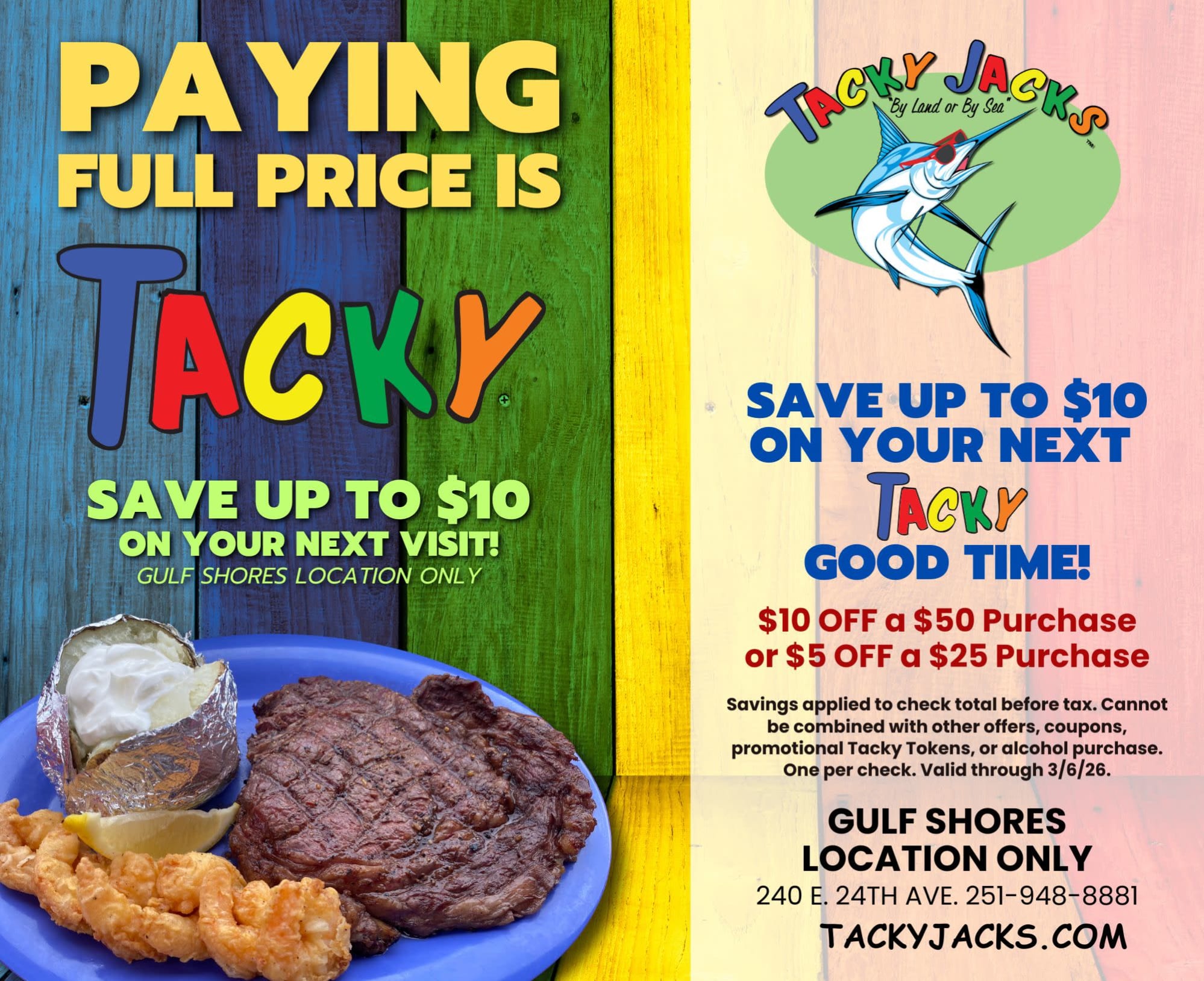 Save up to $10 on your next visit to Tacky Jacks Gulf Shores!